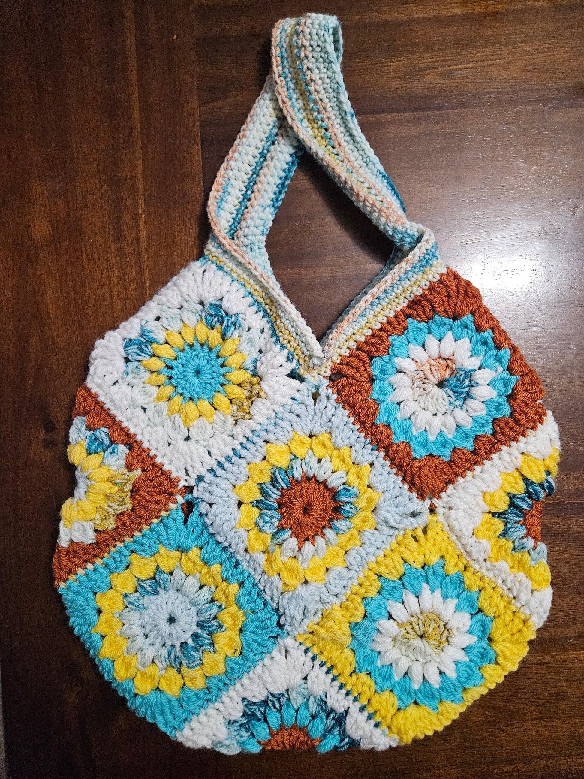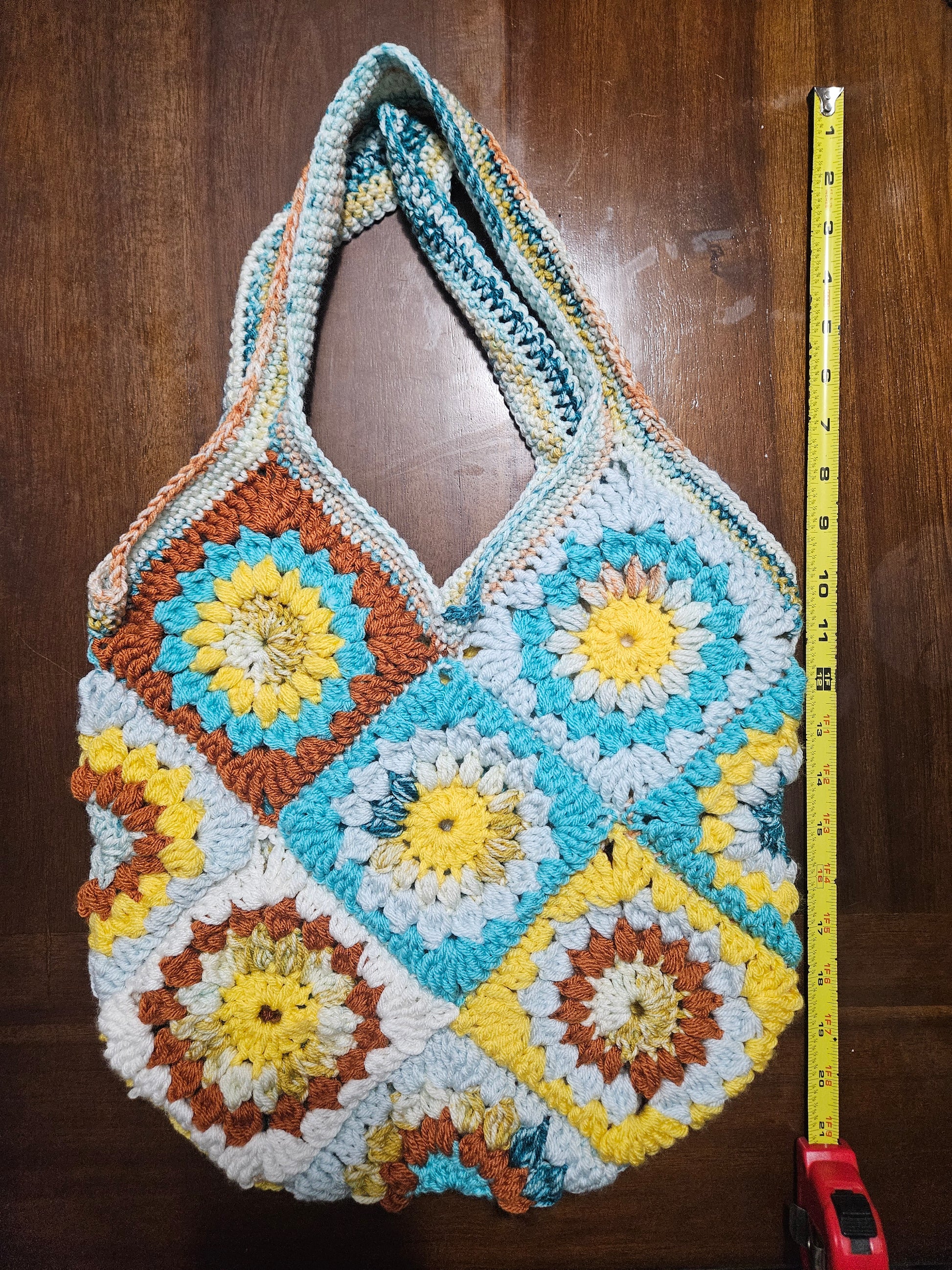 Expertly crafted with intricate detailing, this crochet granny square sunburst purse is the perfect accessory for any outfit. Made with high-quality materials, it offers a unique and stylish look while providing enough space to carry all your essentials. An ideal blend of beauty, functionality, and durability.